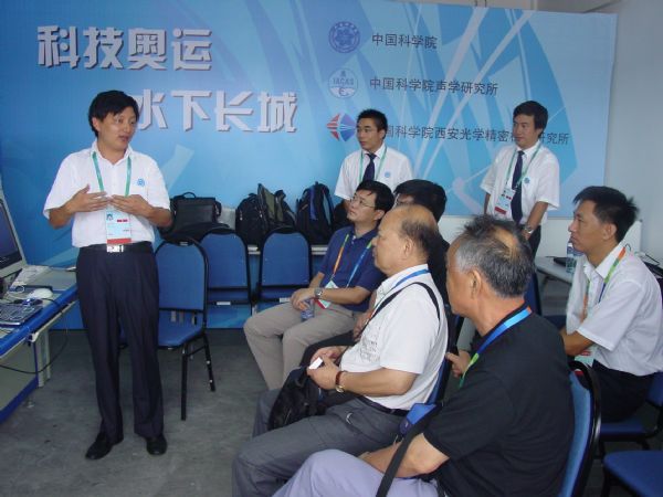在整个任务的执行过程中,得到各方领导的亲切关怀,中科院高技术局信息处戴博伟处长、yx06永兴彩票集团张春华副所长、库卫群处长及院项目监理部的同志专程赴青岛检查工作,慰问现场的工作人员,勉励大家牢记科研工作者的责任和使命,毫不松懈,确保圆满完成奥帆测试赛水下安保任务,充分展示中科院的技术实力和科研人员的良好风貌。在比赛期间,奥运安保领导小组、公安部,青岛市市政府的领导也亲临水下安保现场进行了视察,并认真听取了许枫研究员对水下安保系统的介绍,详细了解了系统的性能指标,对水下安保工作给予了充分肯定和高度评价,鼓励大家再接再厉,确保明年奥运会水下安保任务圆满完成。