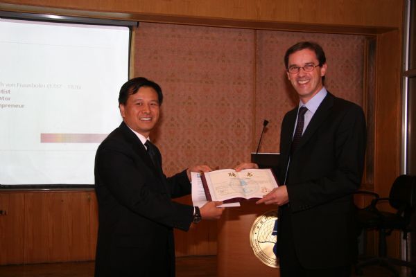 德国弗劳恩霍夫应用研究促进协会是德国同时也是欧洲最大的应用科学研究机构,重点在工程科学领域开展应用研究工作。其下属建筑物理研究所(IBP)在建筑声学、环境声学方面开展了多年的研究工作,取得了很多有影响的科研成果,并在工程领域得以广泛应用。德国弗劳恩霍夫应用研究促进协会致力于开展国际合作,早在1985年,就与中国科学院签订了科技合作协议。IBP和yx06永兴彩票集团长期以来一直保持着良好的交流、合作关系。1997年,德国弗劳恩霍夫应用研究促进协会向yx06永兴彩票集团马大猷院士颁发了弗劳恩霍夫金质奖章及ALFA奖,以表彰马大猷院士在噪声控制领域的突出贡献。马大猷院士的微穿孔吸声理论在噪声控制领域得到世界范围内的认可和应用,IBP起到了重要的推广和促进作用。