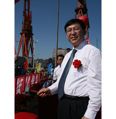 中国科学院副院长阴和俊亲手执斧,为“实验1”号下水“砍缆”