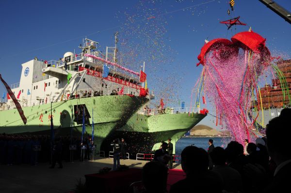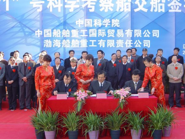 春风拂面,阳光明媚,在葫芦岛市渤海船舶重工公司码头,巨大的红灯笼当空高悬,五色彩带随风飘荡,一艘即将交付的科考船巍然伫立在海边。4月15日下午4时整,交接船仪式正式开始,中科院高技术局局长、科考船经理部总经理田静,渤海船舶重工有限责任公司总经理李天宝,中船重工船舶贸易公司总经理助理张御环分别代表各方在交接船议定书上签字;随即田静总经理挥斧砍缆,现场响起了热烈的礼炮声,白鸽展翅飞向蓝天,一个令人激动、自豪的时刻来到了:我国第一艘小水线面双体科考船——“实验1” 号圆满完成建造并交付。