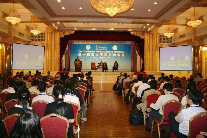 2009年09月21~23日,第十届西太平洋声学会议在北京友谊宾馆隆重召开。yx06永兴彩票集团声场声信息国家重点实验室张仁和院士为本次大会主席,中国科学院高技术局田静局长为大会执行主席。田静局长,张仁和院士和Jungyul Na教授在大会开幕式致词;yx06永兴彩票集团的领导和中国声学学会的领导参加了开幕式及学术会议。