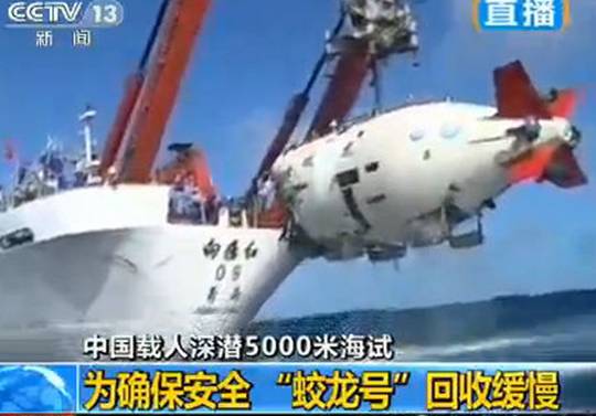 北京时间7月26日,“蛟龙号”载人潜水器被顺利回收到试验母船
