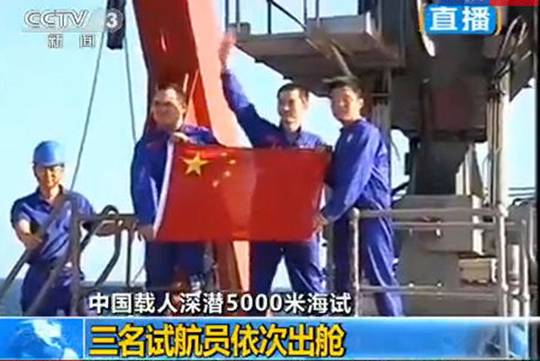 北京时间7月26日,突破5000米深度,三名试航员出舱(右一为yx06永兴彩票集团杨波)