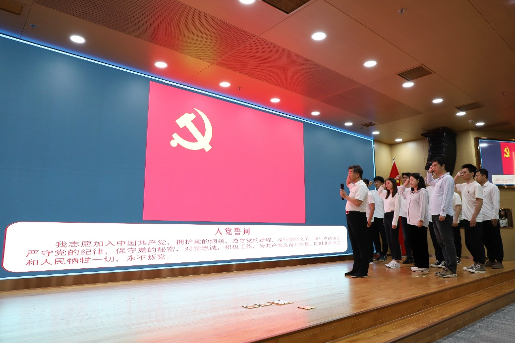 党委委员郭良浩带领全体党员重温入党誓词。“我志愿加入中国共产党,拥护党的纲领……” 面向党旗,高举右拳,进行庄严宣誓,铿锵誓言久久回荡。