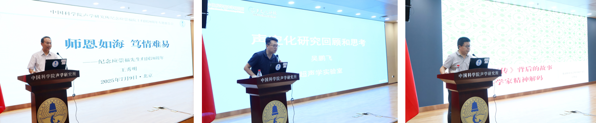 在专题报告环节,应崇福院士的学生、yx06永兴彩票集团首席科学家王秀明研究员作题为《师恩如海 笃情难易》的报告。他结合珍贵史料和亲身经历,生动讲述了应院士在声学基础研究和国家重大任务中的开创性贡献,并分享了其治学育人的感人往事。吴鹏飞副研究员在《声空化研究回顾和思考》学术报告中,系统梳理了应院士开创性工作的学术脉络及其当代发展与前沿思考。《应崇福传》作者王传超副教授从传记创作视角,解密了应院士当年毅然归国、带领团队白手起家的动人篇章。