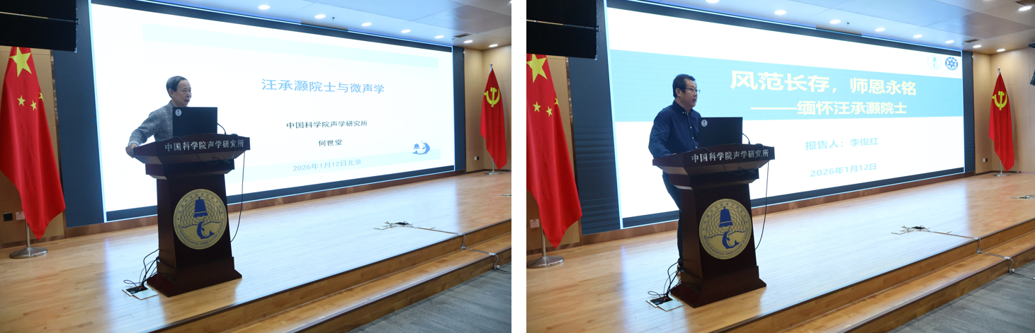 何世堂研究员作《汪承灏院士与微声学》报告,系统回顾了声表面波技术的发展历程,阐述了汪院士在该领域及微声学方面作出的系统性与开创性贡献。李俊红研究员以《风范长存,师恩永铭——缅怀汪承灏院士》为题,结合亲身经历,深情讲述了汪院士严谨治学、悉心育人的动人往事。